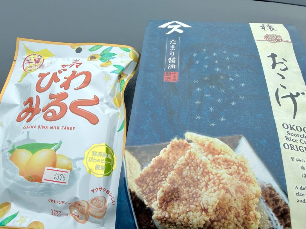飼い主用ドライブのおやつに千葉限定びわみるくキャンディと千葉県産たまり醤油のおこげ煎餅。
