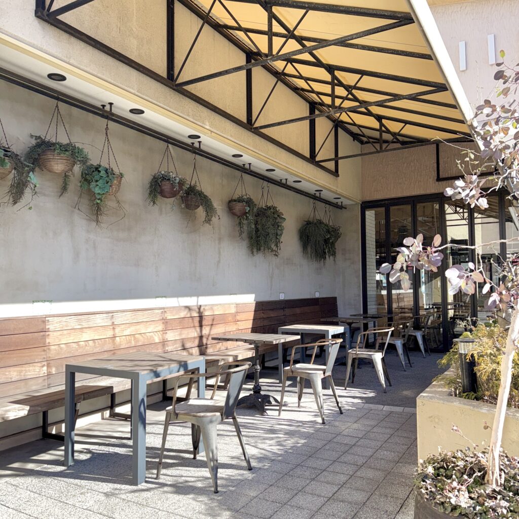 北欧家具アクタスのカフェで、ここのテラス席もちょっとだけ奥まったエリアにあります。オサレなホットドッグとスイーツがあります。